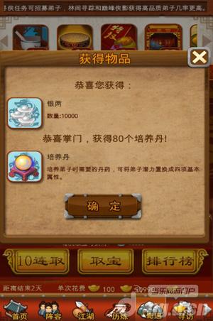 掌门进入大理皇宫,点击取宝即可请段誉出手,段誉将在这八个方格中随机射中一个方格,射中的方格,玩家将获得对应的奖励,在皇宫开放时,掌门每天可以用银子免费射宝5次,超过5次每次需花费100元宝射宝,上不封顶。