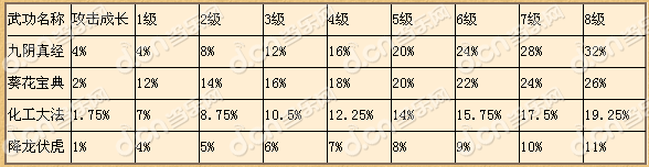 综合以上数据我们可以做出以下分析,在目前出的增加攻击的甲级武功中,属性最高的是九阴真经,(毕竟是甲级武功,有条件的话都会升到顶级)