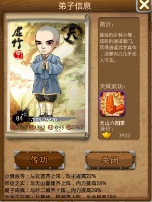 虚竹在三兄弟中排名第二,他的总体能力稍微比萧峰弱那么一点,但是他依然是甲级弟子中排名靠前的实力派高手。自带释放几率超高的甲级技能天山六阳掌,让他一上来就能施展全部的功力,高内力让他在后期十分强势。
