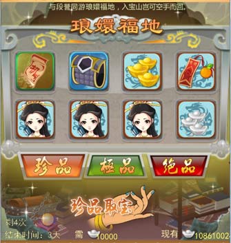 【活动内容】:与段誉同游琅嬛福地,入宝山岂可空手而回。福地共分三层,花费银两或者元宝就可请段誉出手,随机得到一样珍宝。注意!福地只在活动期间开放的哟;想要得到珍宝可要把握这次机会!