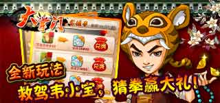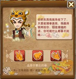 小宝获救之后,赌瘾再犯。只要你能提供他需要的赌本,他就可以和你进行一次高水平、高科技、高智商、上流社会才会玩的高级赌法——猜拳。提供赌本,豪赌一番吧,胜利就可获得小宝给出的双倍奖励哦。所需赌本非常简单,多半是武器、防具或者武功之类的,在江湖关卡中大都可以得到。机会不容错过,赶紧坐定庄家,通杀小宝吧~!