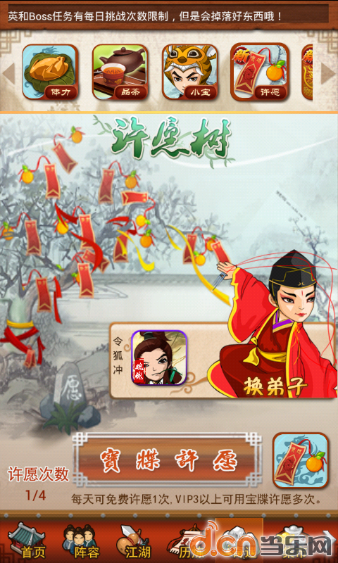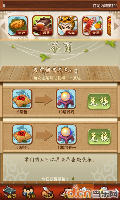 20级开启,每天四次免费选茶机会,个人建议不用元宝刷,反正迟早会喝满。