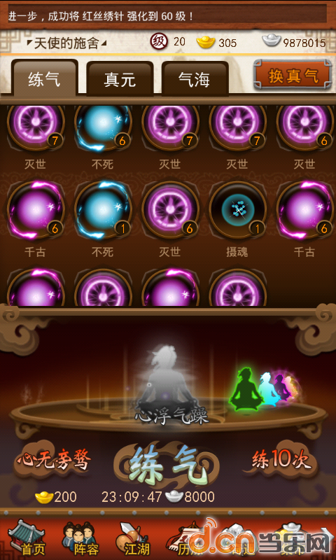 8或19开启,记不清了,唯一的诀窍就是:练气如果是需求经验的话,就一次性把累计的银两花完,如果为了出紫气,就每天练到出第一个紫气就停止