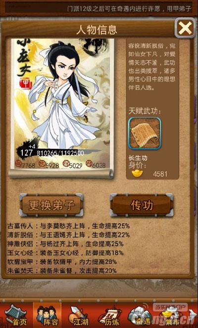 “北方有佳人,一笑倾国再笑倾城”,关于小龙女的冷艳美沐沐在此不再赘言,看过小说和电视剧的宅男一定懂得,沐沐今天主要给大家分析下小龙女弟子的属性和培养方向。从上图我们可以看到,小龙女初始属性和成长属性都比较的出色,其中最大的亮点就在于其防御,高达120的初始防御冠绝大掌门众弟子,防御成长6.5大于段誉的5.8,同级别裸装备的小龙女是大掌门防御最高的弟子,外表柔弱的女子却是最强肉盾的存在哦!