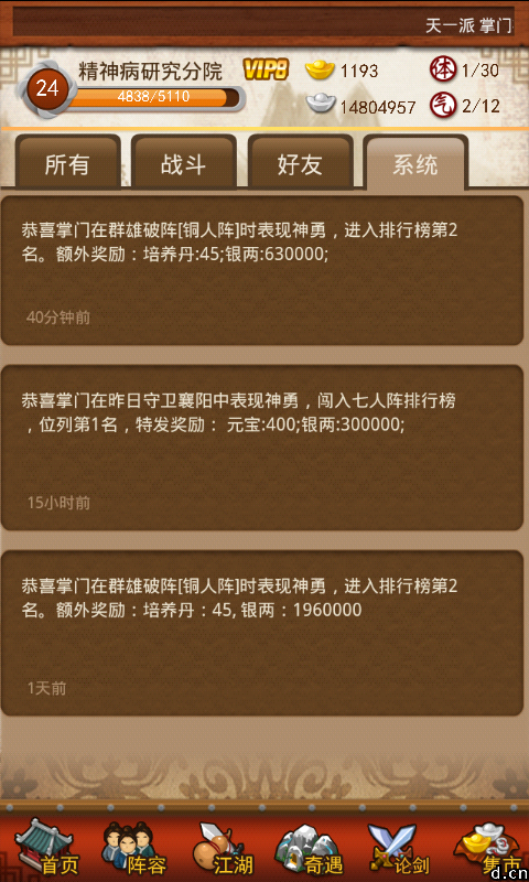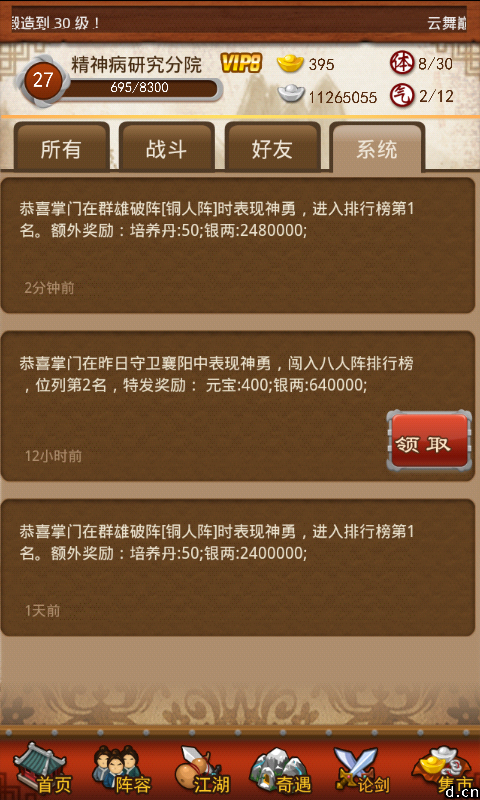 先来两张图,玩了十天不到,每次只是用立即复活。。有些人会疑惑为什么装备比别人好,打出的伤害比别人少,因为群雄破阵所有弟子都会释放技能,合理安排位置武功才能打出最大伤害。我这里说的是针对门派26级的,级别低带不了8个弟子的可以自己调整下。