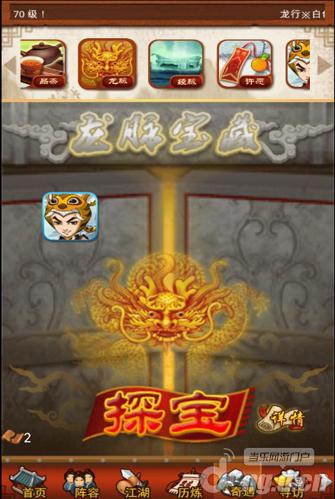 玩家进入龙脉宝藏界面点击探宝即可进入宝藏界面,探宝界面有20个方格分别放置银两、元宝、金叶子、装备精炼材料、许愿宝碟、闭关卷轴、1级到3级武功等秘宝。
