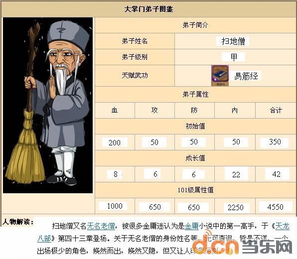 1、天赋武功,大掌门会不会为了他多开一种被动,如果不开,现在的武功易筋经应该是最合适了,但会和原型人物不太相符。应该是加内的武功才对。这样也比较符合他高内的原型。因为扫地僧平不是少林人,所以在他来到少林寺的时候已经是有武功了的,他去那里扫地的目地也是为了学习。(让我想起了少林寺的厨房!汗)
