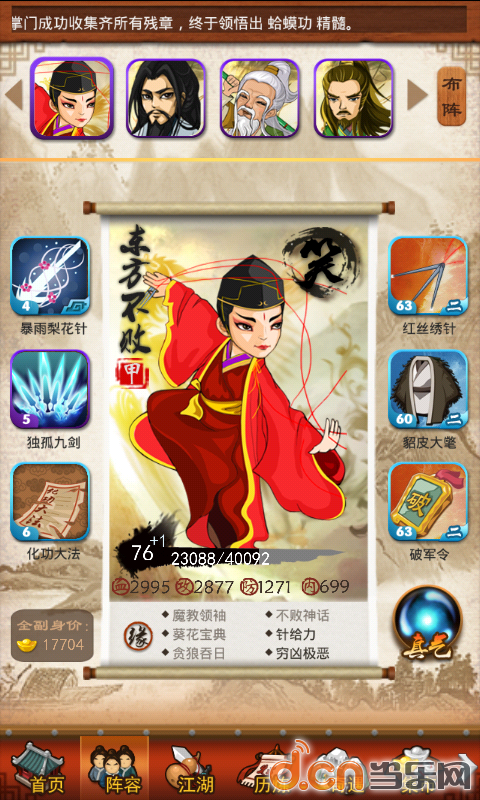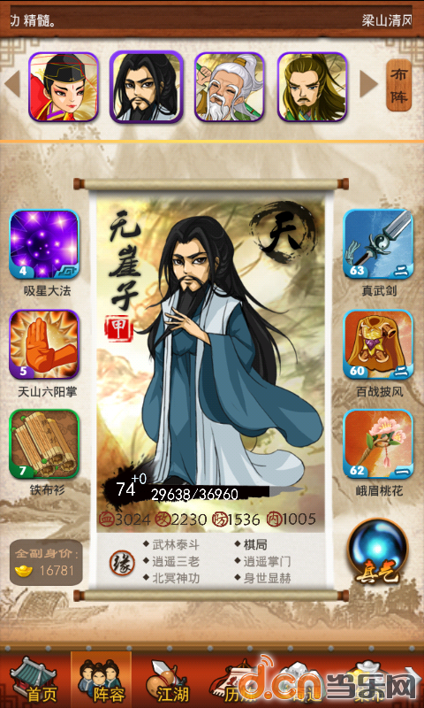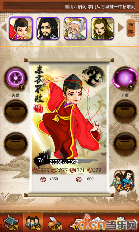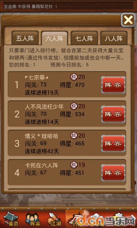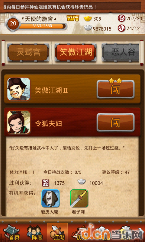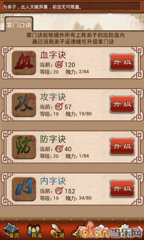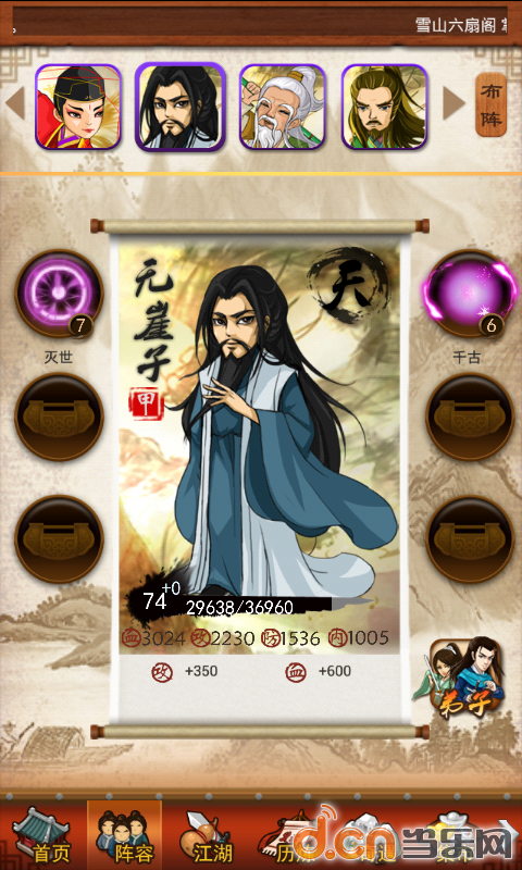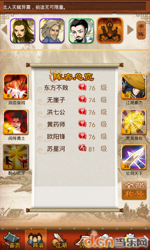然后推江湖,过程尽量打2星,因为江湖越往后(在获得相同威望前提下)越赚经验,3星会给三倍威望和经验,所以不划算的。推到推不动的地方就收手吧,然后去刷刷论剑,稍微刷一点就行,之后大概11级样子,这时候阵上5个人了。然后用女儿红把指点吃了,弟子等级吃到40样子就放着吧。
