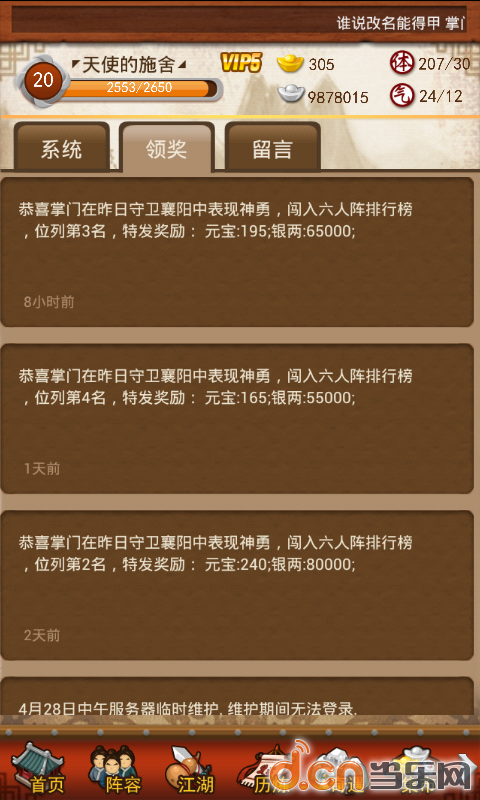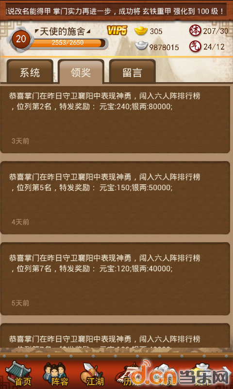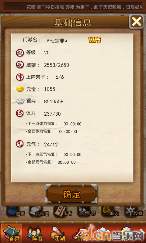 然后到15级,我后来又充了100,开了些箱子,之后论剑和江湖各刷了一些,停在论剑2000名,江湖停在周伯通前面,自然而然五人阵刷了大半个月。这时候弟子等级在55级,培养已经完成3个半弟子。