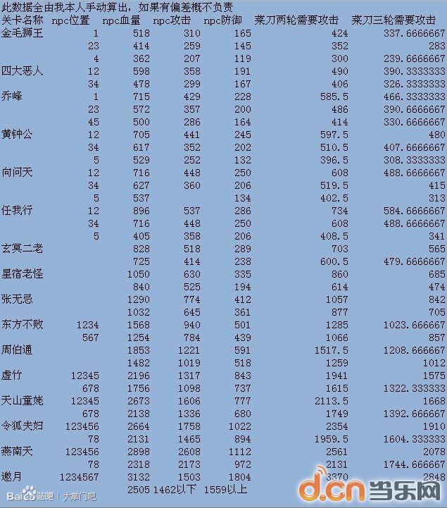 卡指点的过程就是这样,然后这时候加首刷第二个弟子已经出了,我选择了一个出东方和洪七公的号,充了100元,首充翻倍加充值返利一共获得3000元宝,这些我刷甲弟子出了欧阳和黄药师,吐槽下这2个坑,之后剩下的买vip礼包和开箱子,出了些乙装,然后在12级的时候我把指点用女儿红喝了,弟子等级大约45-50左右了,然后开始培养,之后继续深推江湖,记得能推倒东方不败,江湖的boss属性是有总结的,贴图一张。