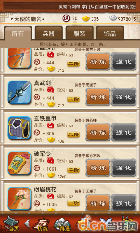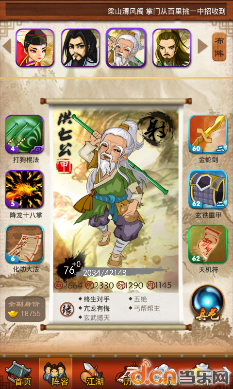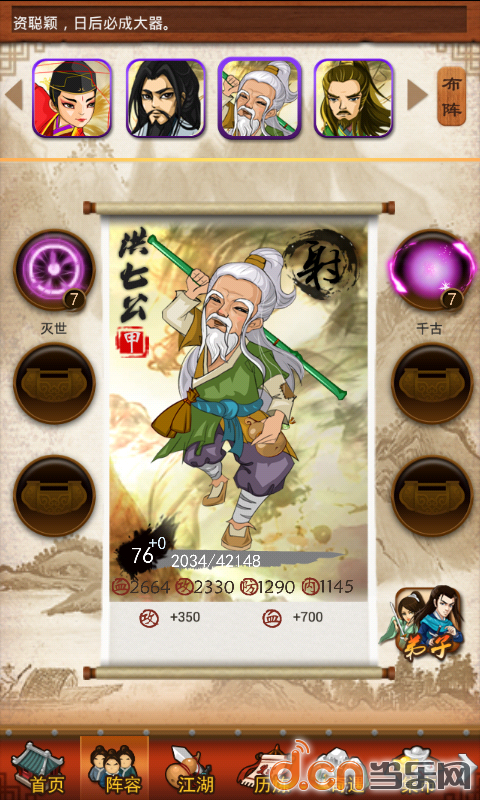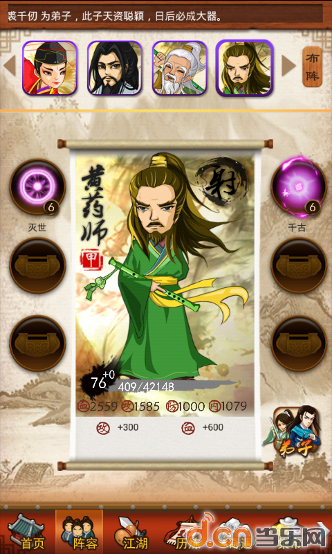 之后经过系统一系列教导会给你第二个乙,推荐出裘千仞(多建小号刷),之后江湖往后推,3级可以招第三个弟子,推到第二关boss慕容复,好运的话爆将军铠,这件装备可以用很久,然后继续推到第三关boss鸠摩智,这个爆的圆月弯刀可以用很久。