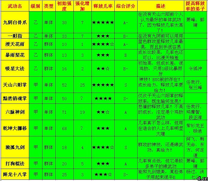 1)只包含游戏里好用乙和甲级主动武功,不是全部!