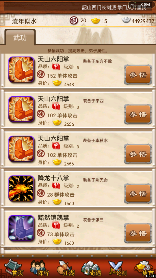 技能,大家应该都很熟悉,甲技能推荐天山六阳掌,独孤九剑,黯然也是不错的,同样,技能也需要升级,我记得有人问过,为什么九阳神功加5%的内力还是甲武功,因为成长好,比如天山,升一级加25,黯然,升一级加23。。。技能升级时很有必要的,升级的时候,建议一次丢一本,不要丢太多,前期多升级几本,毕竟不止一个弟子,升到3级就差不多了,有实力的可以升到4级5级。。。缺甲武功的话,建议升级九阴白骨爪和满天飞雨,3级就够了。。。还有,我觉得配个降龙伏虎是很有必要的,例如东方,一个天山,加个降龙,自身技能3级~~~绝对牛B,化功暂时没有,不过这样的配置也不错了。。。
