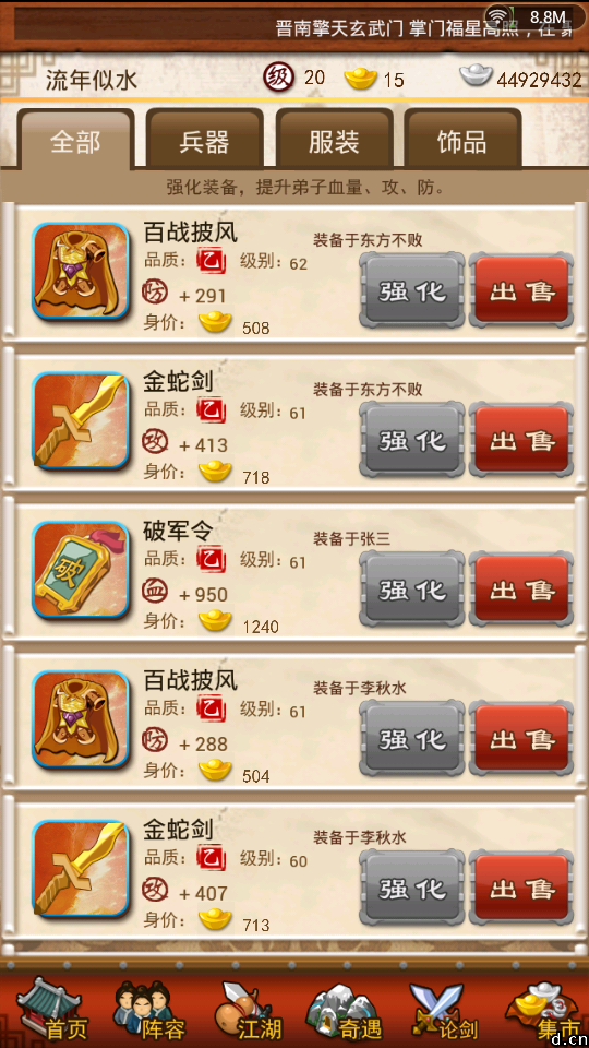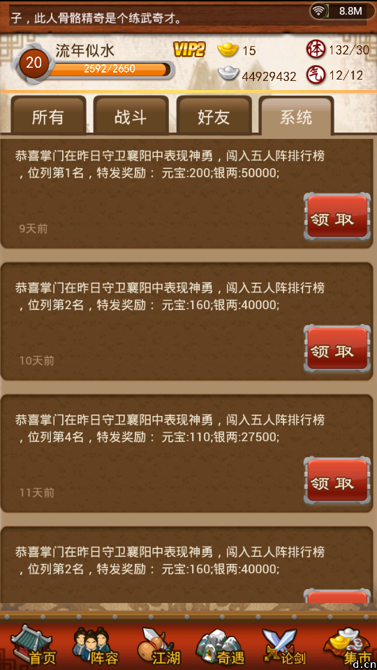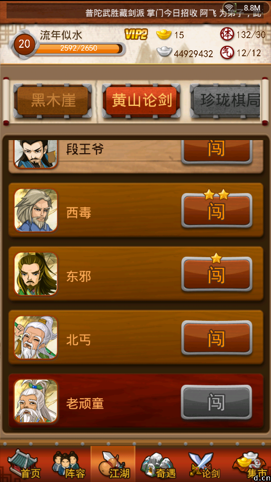 写了一大堆,血战才是重点,血战,才是非R玩家能够玩下去的根本保证,同时也能让游戏的寿命更长久,这也是我最喜欢的部分,血战11级开放,所以我在前面说要升到11级,11级以后,不要急着升级,慢慢来,尽量打靠后的江湖关卡,简单一点就是打自己失败的前一关,因为这样,弟子的经验多,我记得有人问过,为什么相同的等级,别人的弟子等级那么高,原因除了点拨之外就是这个,我自己20级,好几个弟子60多级。。。