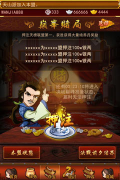 所有加入联盟的玩家皆可以在此选择自己认为可以获胜的联盟,并且在10W银两,100W银两,1000W银两中任选一种进行押注,获胜各可获得20培养丹,50培养丹,150培养丹,若失败则损失掉所压银两。