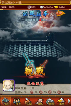 在向紫禁之巅行进中会随机遭遇敌人,战斗胜利后有机会获得天榜(地榜)宝箱,培养丹,银两。开启宝箱将有几率获得至尊武学《九阴真经》。