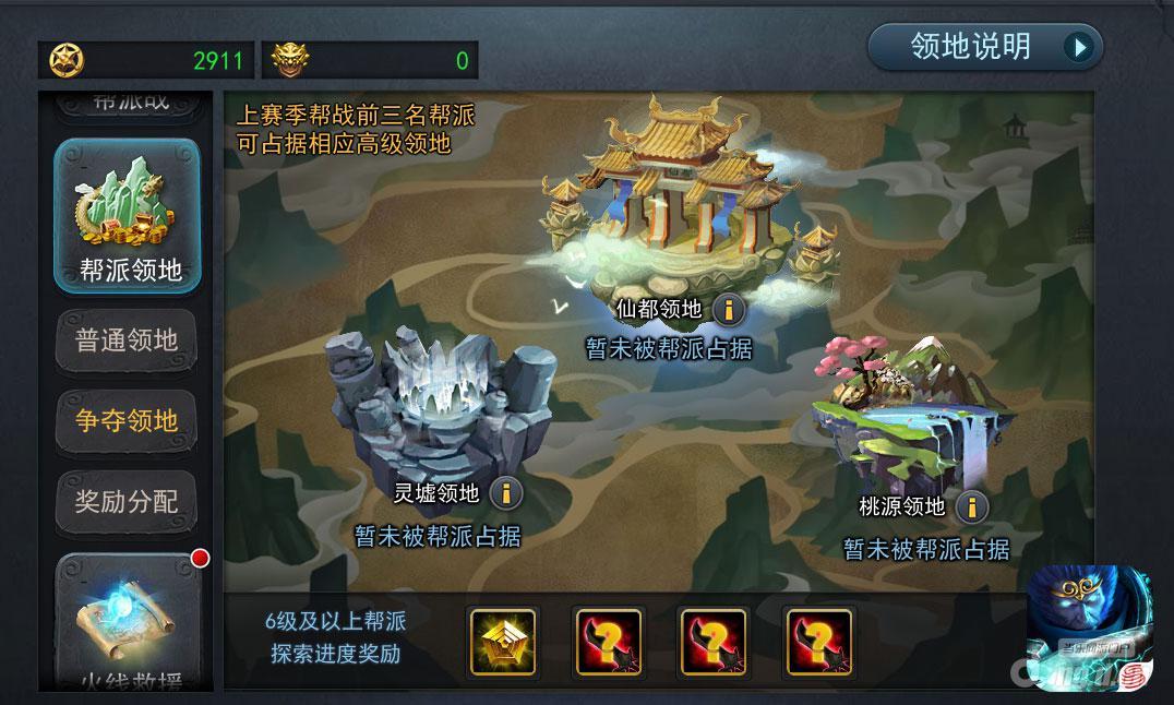 上赛季帮战前三名帮派可占据相应高级领地