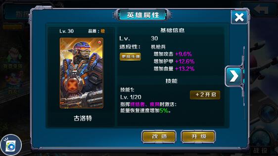 玩家可以在指挥官界面,改造、升级英雄,英雄等级越高,属性越强;级别越高,属性也越强。