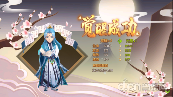 在御灵页面可以看到觉醒的选项,点开即可看到御灵的身份信息以及攻防资料,通过觉醒面板上的功能按键可以看出觉醒前后的属性变化。