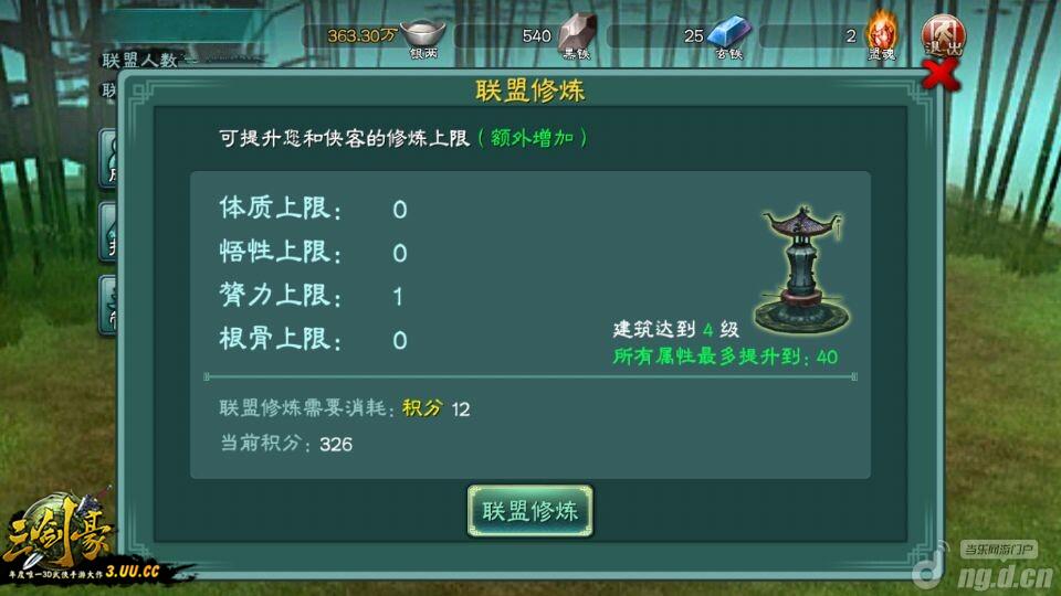 玩家在完成联盟任务后除了获得高额经验奖励之外,还将获得联盟积分,积分可以进行联盟修行,联盟修炼可以提高玩家和所有侠客的体质、悟性、臂力、根骨上限,并且增长率是永久性的。