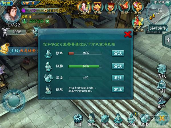 游戏主要以主线任务副本为主,通过修炼、升级经脉、招募侠客英雄、布阵来使自己变强,除了主线副本任务以外,还会有野外副本等你挑战,能获得更多的金钱和经验,还有机会拾取各种珍贵材料。