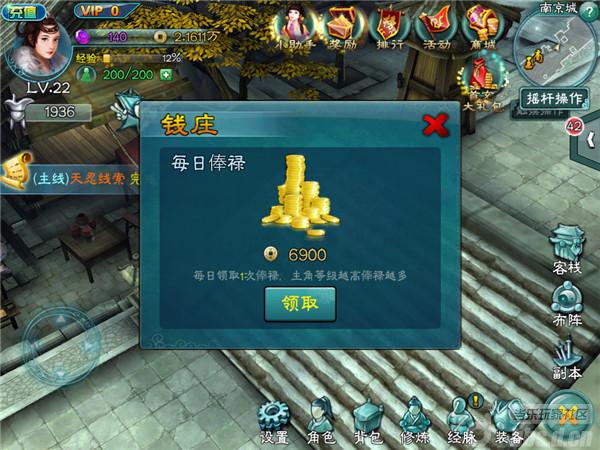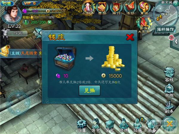强化、升级经脉等都需要花费铜币和宝石,在这里宝石能通过每天的签到获得少一部分,主要是充值获得,兑换比例是1:10,即1元=10宝石。铜币的获取途径相对较多,有签到、领取成长礼包、副本通关、钱庄也可以用宝石来兑换铜币。