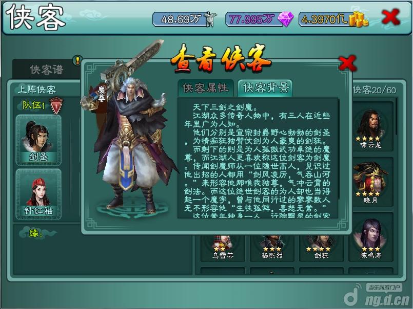 江湖纷争再起硝烟,华山之巅看真正强者风云,武林争霸谁主沉浮。一剑寒光黯月色,幽兰初现,全新挂件,霸气坐骑,正邪对决势不可挡,江湖浩劫一触即发! 游戏特色 **不真实,不武侠! 南京古城,黄沙战场。单反级视觉体验,绝对真实江湖风情。 **不PK,不武侠! 30v30同屏大战,更新增跨服激战。乱战尽显英雄本色。体验刀刀见血的痛快! **不兄弟,不武侠! 江湖怎可少了纷争?帮会互战,城池争夺,野外抢怪,血雨腥风后,堆积大侠威名! **不技术,不武侠! 拒绝无脑互砍,侠客搭配拼智商,对战技能秀技术。百种侠客选择,万种技能搭配,以弱胜强,无不可能![详情]