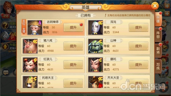 进入【英雄】界面后,点击英雄头像右侧的【提升】即可进入英雄养成界面!