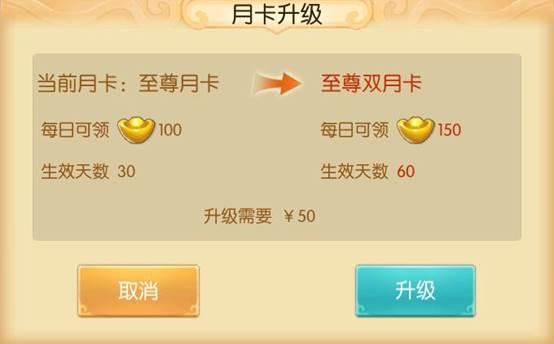 另外就是升级至尊月卡这个东西,存在争议,虽然说每日多50元宝60天就是3000元宝,但是如果你分两个月买,其实也就少总量的一些,但是你不会一次性消费100,弄不弄看个人吧。