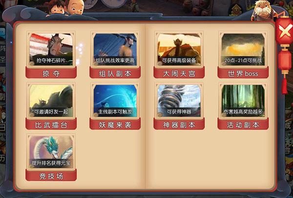 点击副本即可直接进入任务剧情副本;点击日常可以看到日常完成的任务,进入后日常界面后,点击对应的任务即可快速开启该任务;点击历练入口,直接开启历练副本,历练里面的玩法掠夺、组队副本、大脑天宫、世界boss、比武擂台、妖魔来袭、神器副本、活动副本、竞技场。