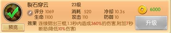 裂石穿云,短CD普通伤害、附带降低敌方伤害的效果,从面板上来看掌控的号敌方绝大部分时间都会处于带着降攻DEBUFF的情况,极好的提升了生存能力。