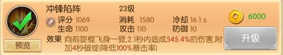 冲锋陷阵,从表面上来看伤害一般,CD偏长,附带BUFF降低对方暴击率,在前期无论怪物或者玩家的暴击率都不会高,因此这个技能在中前期不推荐佩戴。