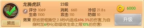 龙腾虎跃,动作时间偏长,伤害一般,但是6秒的10%生命值护盾简直好用,灵猴本身比较缺乏恢复手段,10%生命的护盾对于3X过图具有极好的提升。