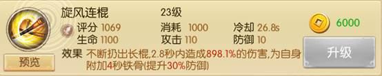旋风连棍从面板上就看出动作时间偏长,高伤害,防御属性BUFF,整体技能很全面在对战BOSS时掌握好BUFF时机能减少不少伤害。