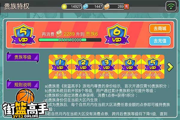 VIP等级在《街篮高手》中以“贵族等级”展示,贵族等级的提升是通过消费点券获取,消费1点券便获得1积分,不用单独购买,贵族身份仅可在本区内生效。不过值得注意的是,贵族等级只要当月有消费便会维持,当月不消费时将会降至1级,不过当你重新开始消费后,又会激活为原来的贵族等级。