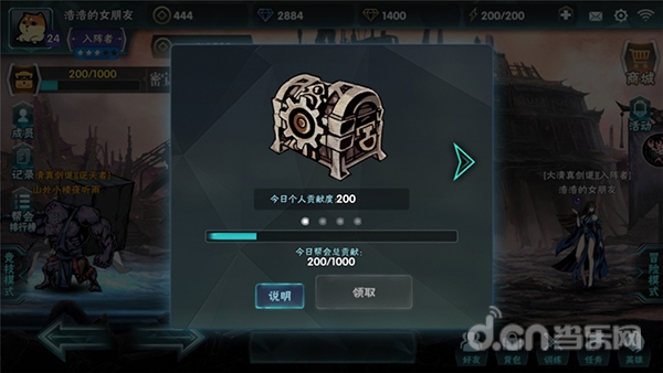 在帮会中每天进行各种活跃行为可以获得帮会积分,从而开启不同大小的帮会积分宝箱。所有帮众的贡献度达到一定程度可以打开左上方的宝箱,贡献度越高,能打开的宝箱越多,宝箱的珍贵程度也越来越高。