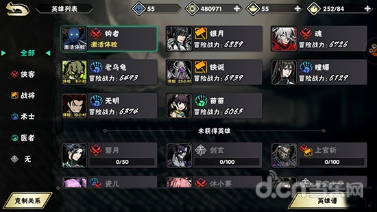 这边介绍一下本作的英雄,英雄分为四类,即侠客(标志剪刀)、战将(标志锤子)、术士或医者(标志蓝手)以及无属性英雄。这就相当于剪刀石头布一样,前三者之间相互克制,并且用克制对手的英雄可以提高伤害,而无属性则孤立于三者之外,不被克制,也不克制他人。