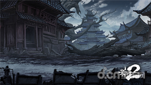庞镇是烨城周边第一重镇,原是商旅不绝的繁华之所,如今却被恐怖的气氛笼罩。残阳落尽最后一丝余晖,虽是暮色四合,楼宇中却丝毫不见人间烟火的气息。压抑黑灰色成为画面的主色调。由远至近给人以强烈的视觉冲击,不知不觉就把目光聚焦到画面中央的空地。在如此萧瑟的地方与各路高手较量,内心油然而生悲辛与苍凉。