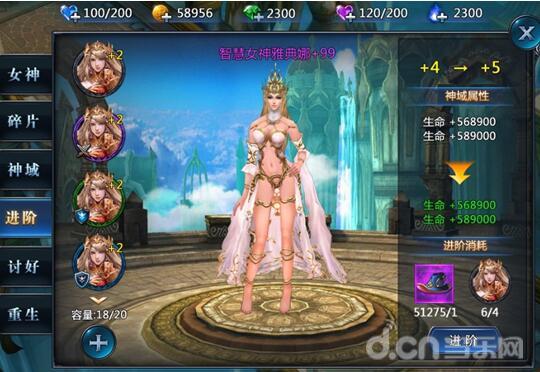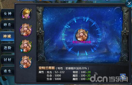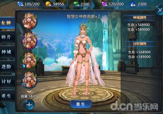 角色和三个出战合体幻兽各可选择一个神域,神域上可任命女神(不同神域孔数不一样),任命女神后可为对应目标增加属性