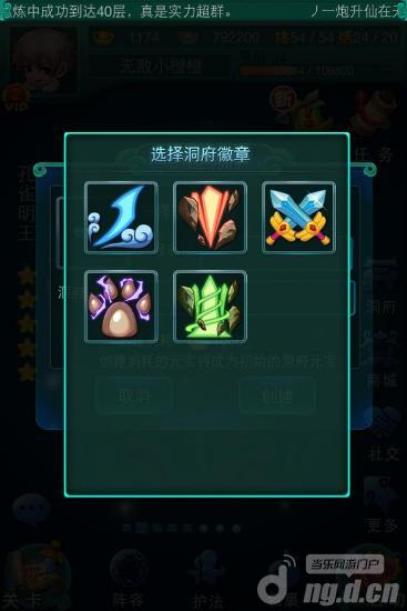 玩家点击“洞府”按钮即弹出对话框:加入洞府和创建洞府。玩家可选择加入已有的帮派成为其一员,也可自己创建新帮派。玩家等级达VIP3可创建新帮派,填写“洞府名称” 、“洞府口号”和“洞府徽章”,并消耗1000元宝,你就拥有自己的帮派啦!