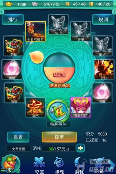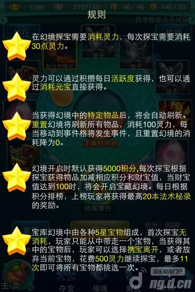 幻境首次开启时,每位玩家都将默认获得50%财宝值,根据每次探宝所获得的物品加减相应积分和财宝值,财宝值达到100时,就会开启宝藏幻境。宝藏幻境由各种5星宝物和玩家进入前的珍稀物品组成。宝藏幻境一共拥有11件极品道具,玩家可以根据自己的需求合理进行选择,揽获心仪之物。