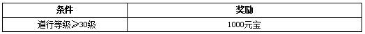 活动期间,道行等级达到30级的玩家,将获得1000元宝奖励!奖励将在次周更新维护后发放。