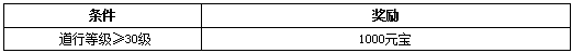 活动期间,道行等级达到30级的玩家,将获得1000元宝奖励!奖励将在次周更新维护后发放。