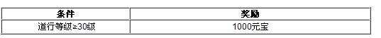 活动期间,道行等级达到30级的玩家,将获得1000元宝奖励!奖励将在次周更新维护后发放。