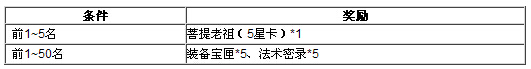 每个新服开启后,参与关卡闯关活动就有机会赢取大礼哦,排名靠前的玩家不仅可以获得珍惜的装备宝匣与法术密录,更有五星金卡菩提老祖等你来拿!