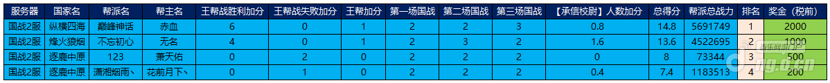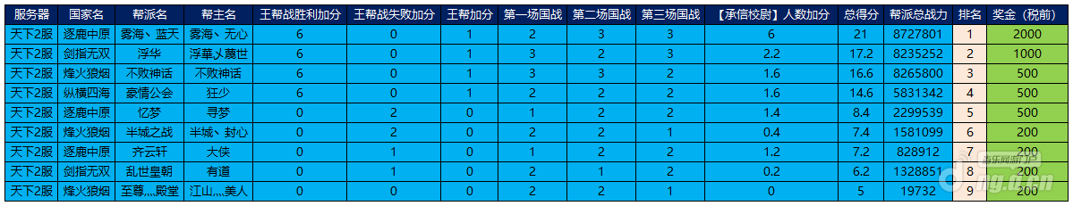 根据“问鼎天下”公会争霸赛 的规则计算相关积分,我们已将7月26日到7月28日开放的4个区服中的活动报名公会(通过官方+渠道报名)的积分,按照从高到低的顺序进行排列,请见下方表格。