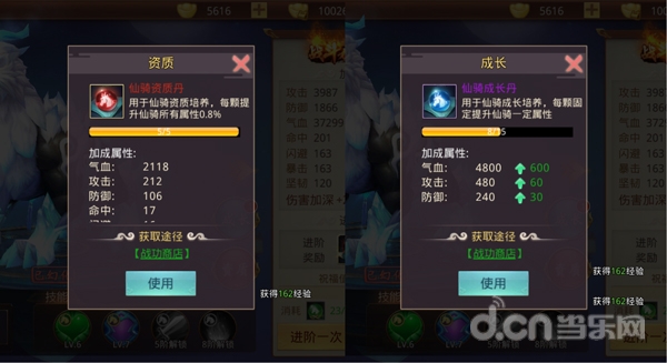 在系统模块达到3阶之后,可使用对应的“成长丹”,每颗“成长丹”可为人物角色增加攻击、防御、气血属性。系统模块达到4阶之后,可使用对应“资质丹”,每颗“资质丹”可以提升对应模块所有属性0.8%。模块的阶数越高,可使用的成长丹和资质丹越多,同样每颗成长丹和资质丹增加的属性越多。