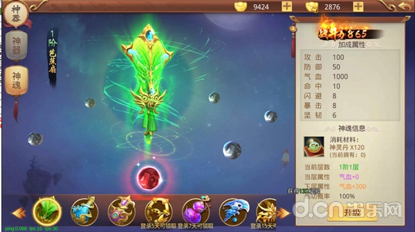 神器可以通过消耗“神魂丹”进行升级,从而提升神器属性。当神器需要升阶时,需要消耗对应神器的“精魄”。每个神器可为人物增加大量属性,属性可叠加。神魂丹与精魄可通过神魂副本获得。
