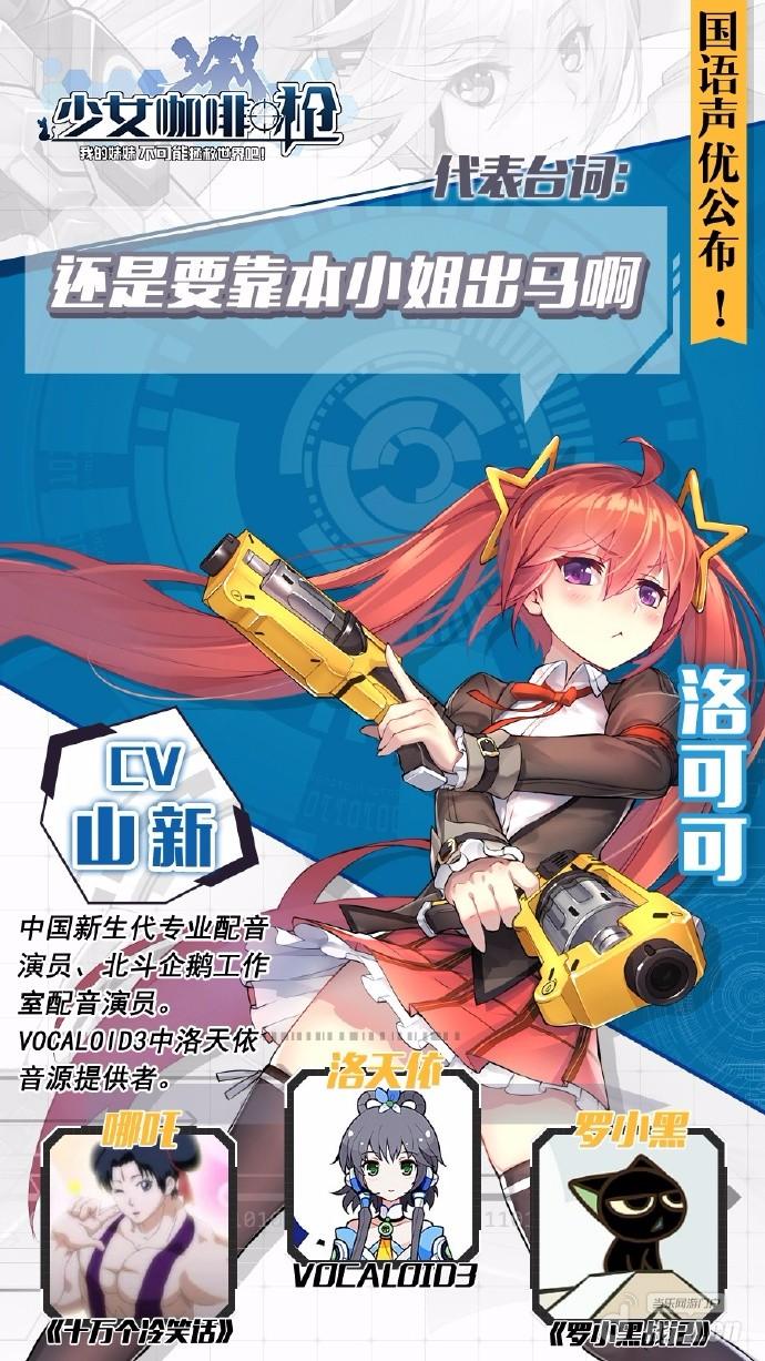 伴随着开放演习的火热进行,《少女咖啡枪》中文CV全面解锁!国内新生代专业配音演员、北斗企鹅工作室配音演员山新为游戏倾情献声,演绎了游戏中傲娇大小姐洛可可。
