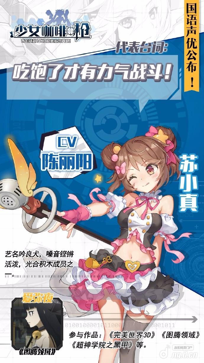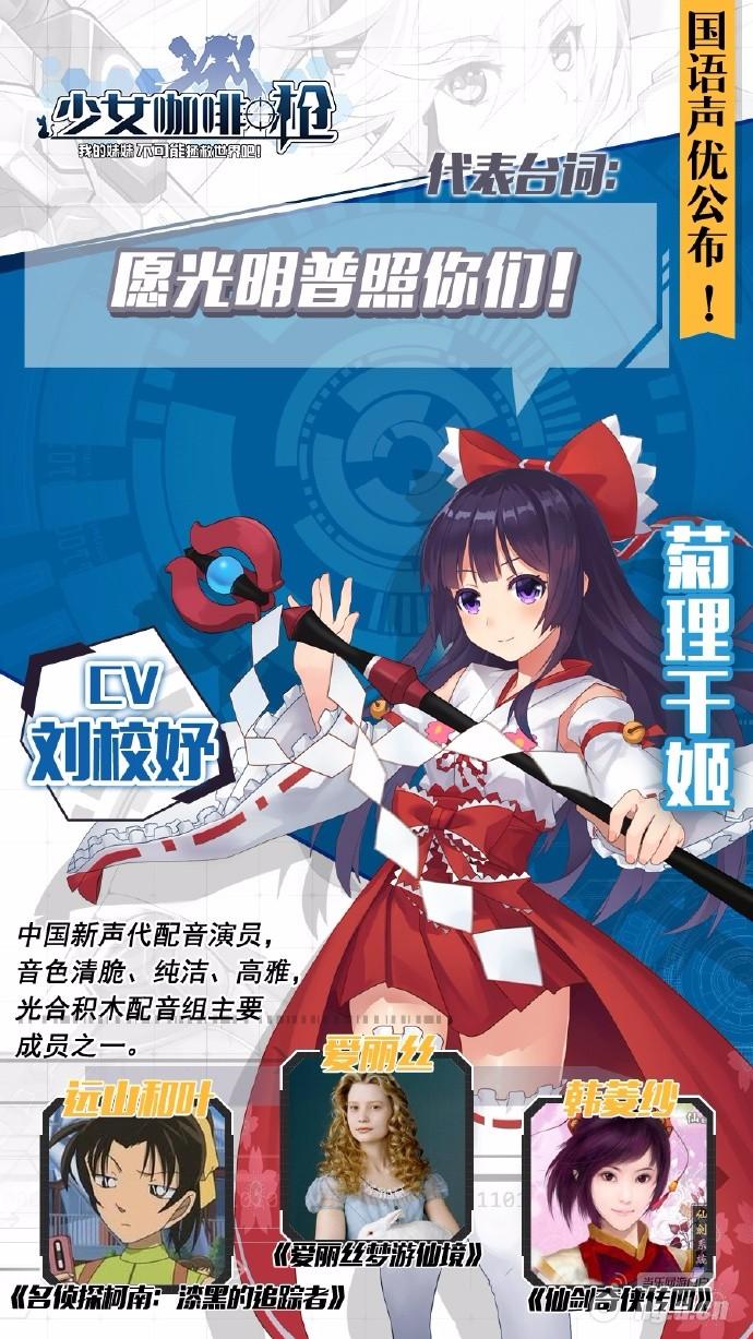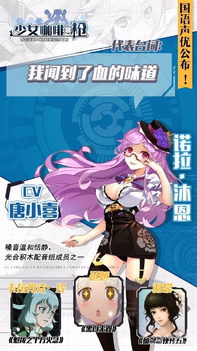参与配音的还有知名配音李珊珊(高奈利亚中文CV)、唐小喜(诺拉沐恩中文CV)、陈丽阳(苏小真中文CV)、刘校妤(菊理千姬中文CV)。强大的配音阵容只为给店长大人们带来最完美的游戏体验!